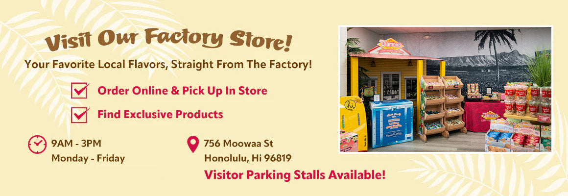 Welcome to the Diamond Bakery Factory Store, where you can experience the flavors of Hawaii up close and in person! Skip the wait for shipping and explore our wide selection of locally made treats, perfect for gifts or for indulging yourself.