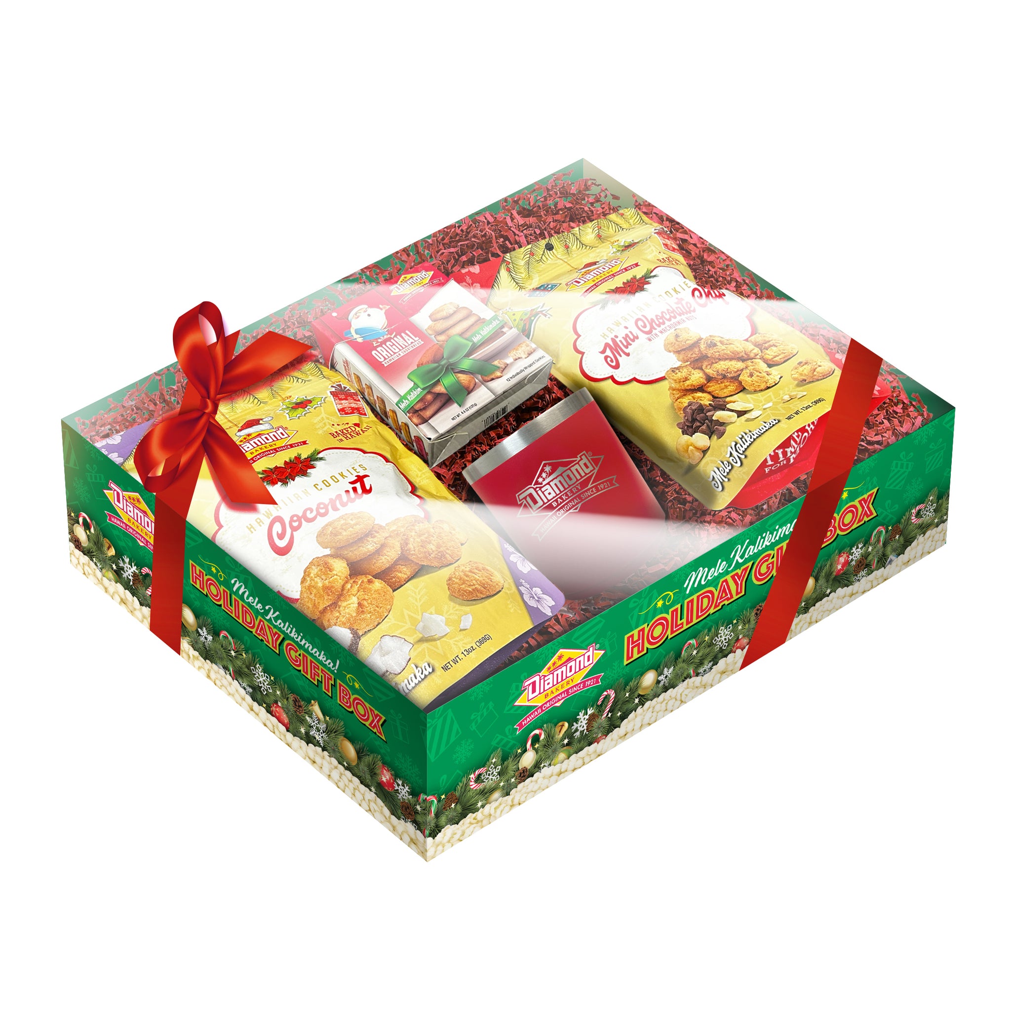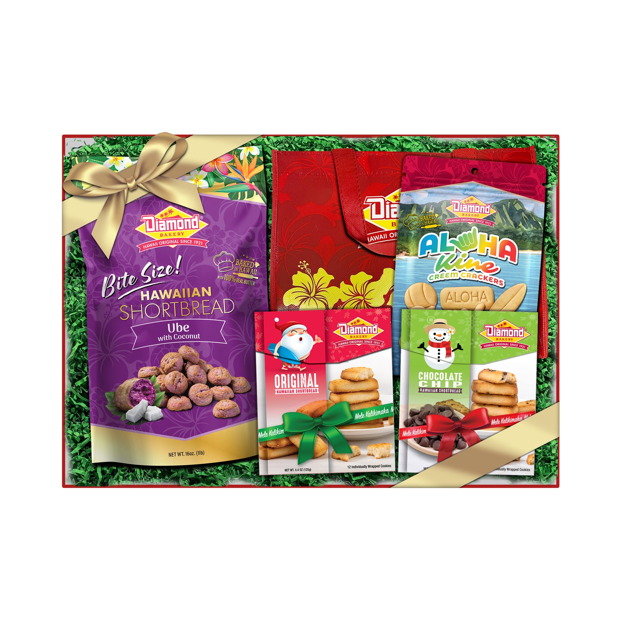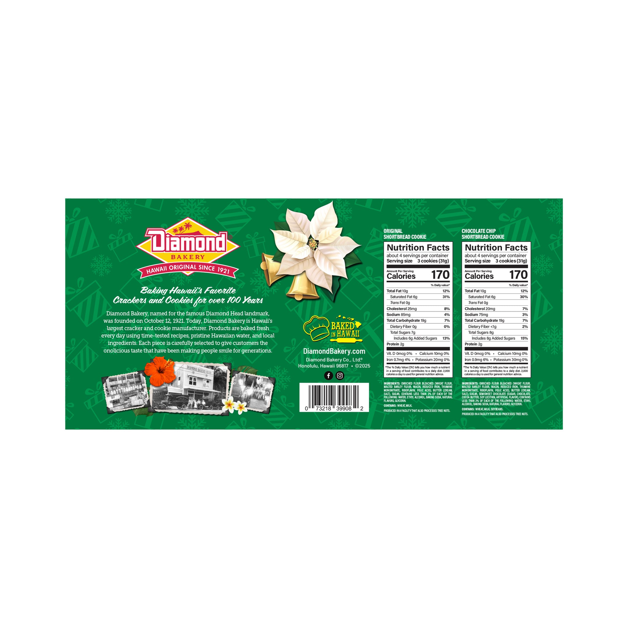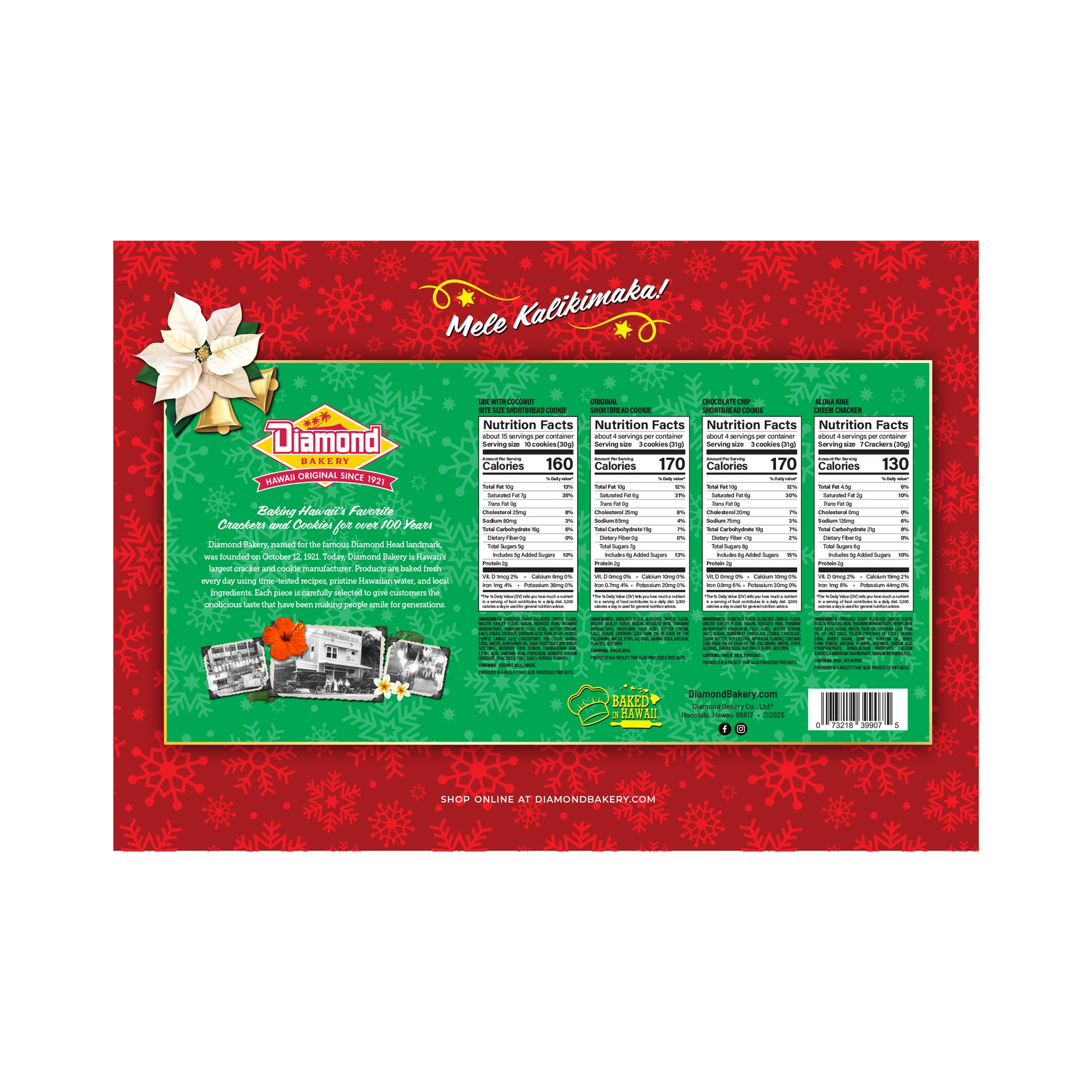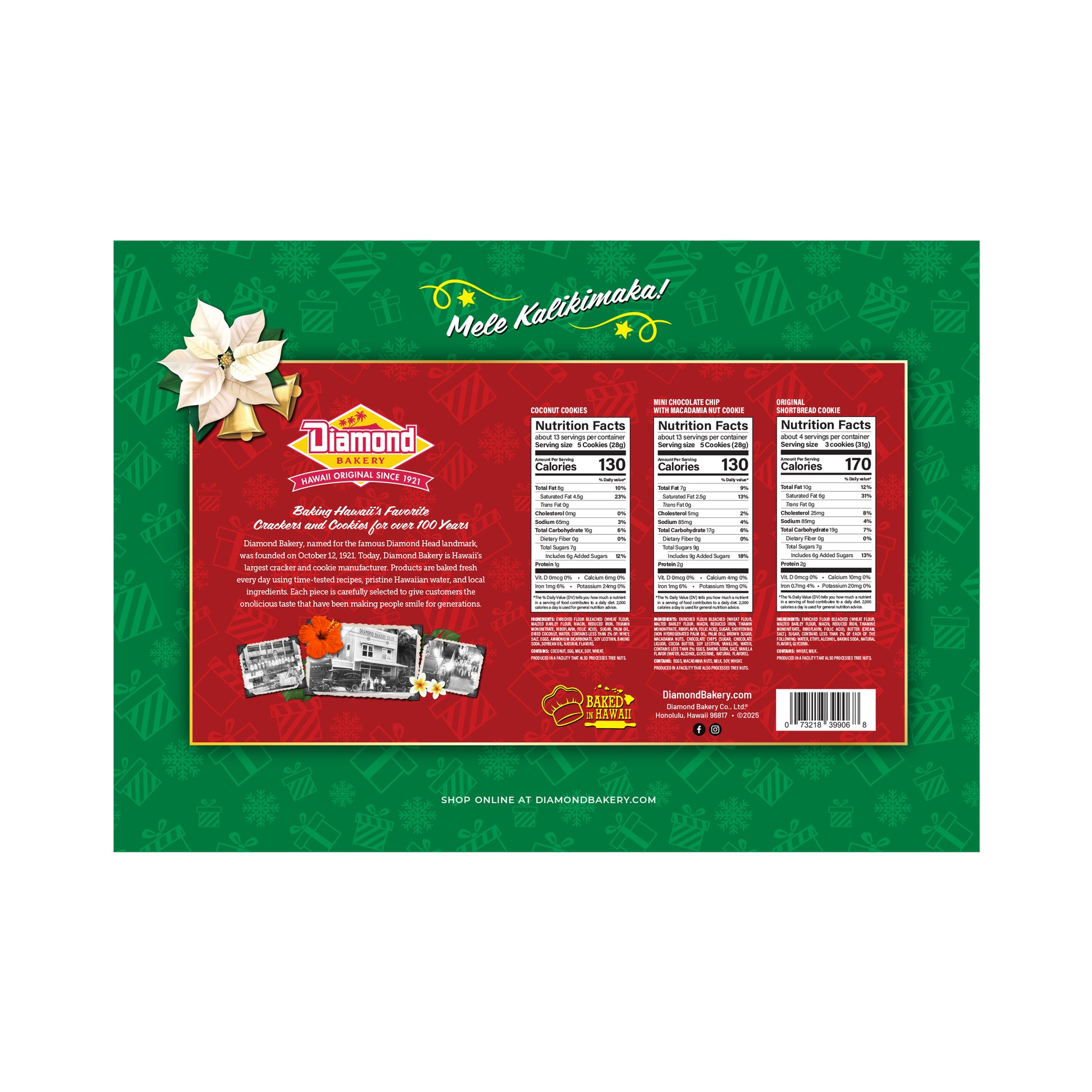 Get that Holiday feeling with our seasonal packaging. Perfect for hostess gifts or entertaining! The fragrant aroma of coconut permeates our island home, and it's hard to escape images of white sandy beaches and swaying palm trees when you dip into a bag of Diamond Bakery's Made-In-Hawaii Coconut Cookies. Finely shredded bits of coconut, and buttery perfection in every bite.