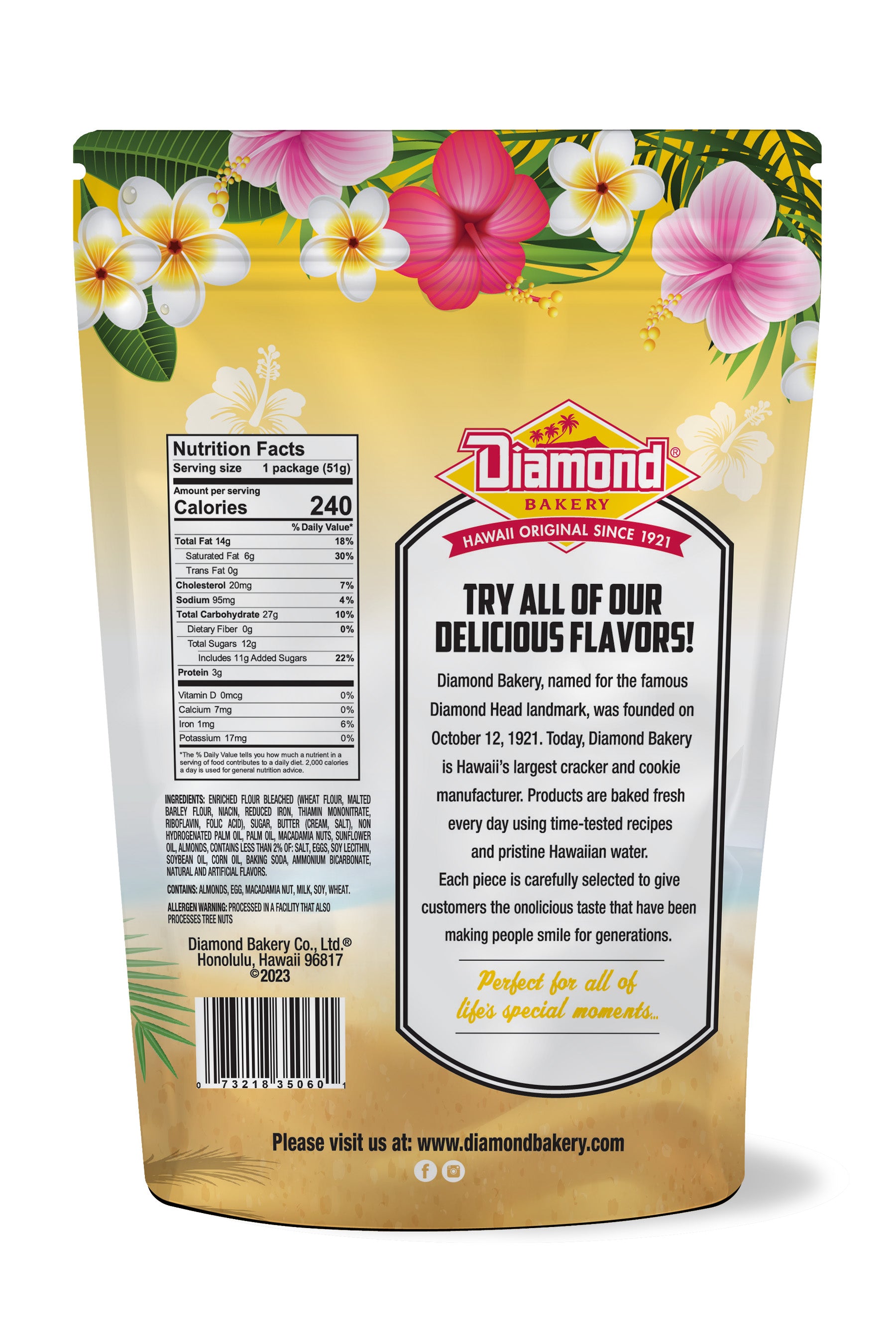 濃縮小麦粉漂白(小麦粉、麦芽大麦粉、ナイアシン、還元鉄、チアミンモノニトニレート、リボフラビン、葉酸)、砂糖、バター(クリーム、塩)、パーム油、マカダミアナッツ、水、2% 未満含まれる物: コーンシロップ、シリコアルミン酸ナトリウムの卵、マーガリン(パーム油と大豆油、水、塩、大豆レシチン、モノグリセリド、ソルバテカリウム防腐剤、クエン酸保存剤、天然および人工フレーバー、β-カロテン色、ビタミンAパルミネータート、ホエー)、ベーキングソーダ、コーンオイルおよび/または大豆油、炭酸アンモニウム、塩、大豆レシチン、天然および人工フレーバー。