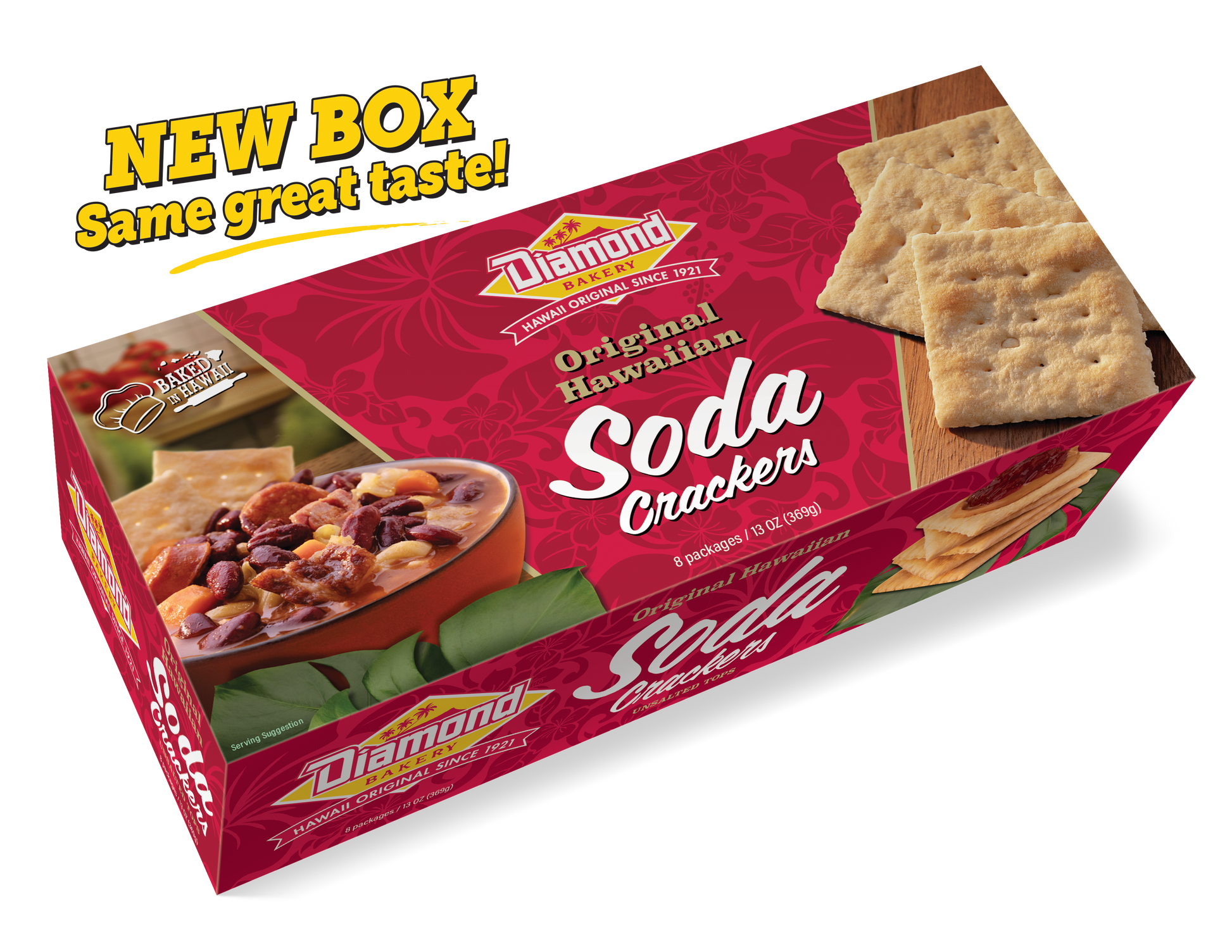 These onolicious (tasty), hearty crackers have stood as the foundation for Diamond Bakery for over 80 years, and the full flavored taste in each crunchy bite is what sets our Original Hawaiian Soda Crackers apart from all the rest. For many island families, this cracker continues to leave lasting impressions of memories old and new. Our cracker is well established as a local tradition in simple recipes and comfort foods passed from one generation to the next. Unsalted tops.