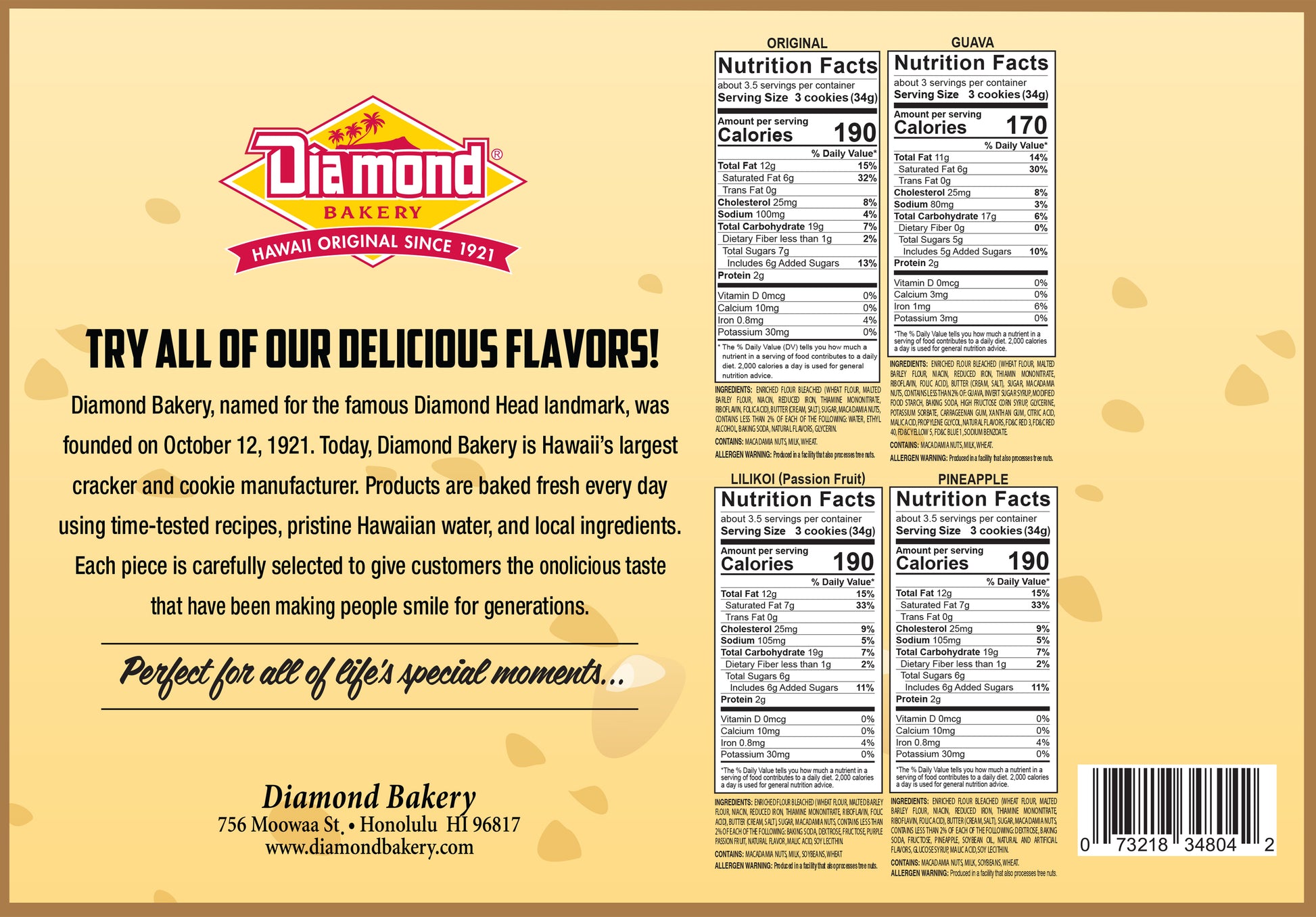 Bring the flavors of the islands to your next gathering with the Diamond Bakery Surf Pack! This tropical assortment of Hawaiian Macadamia Shortbread Cookies includes delicious flavors like Original, Pineapple, Lilikoi, and Guava. Perfectly packaged for gifting or sharing, each bite is baked with aloha and the highest quality ingredients. Ride the wave of taste and savor a piece of Hawaii.